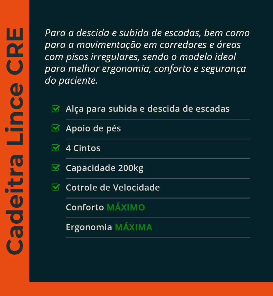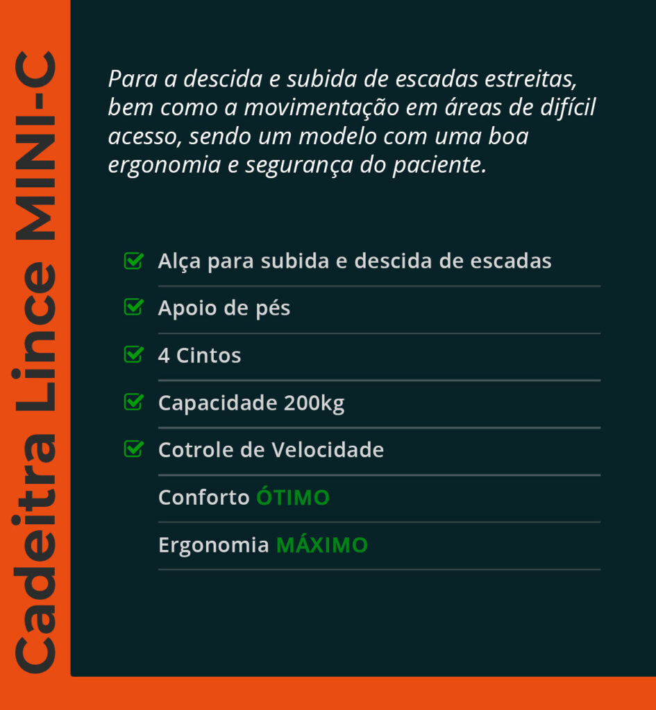 A cadeira Lince, é um produto inovador e essencial para emergências. Sua capacidade de descer escadas com eficiência, agilidade e segurança é impressionante, proporcionando um transporte rápido e seguro de pacientes, mesmo em ambientes mais desafiadores. Uma solução diferenciada que garante a segurança e a mobilidade necessária em momentos críticos.