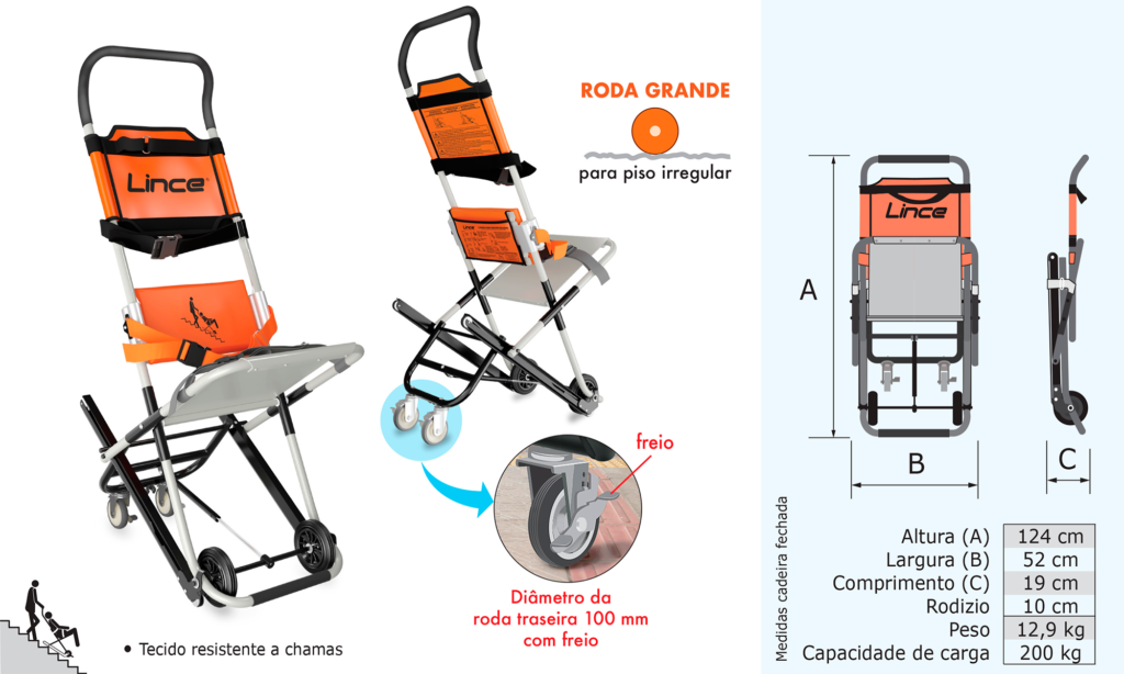Projetada para facilitar o transporte de indivíduos com dificuldades físicas, a Lince SRE proporciona uma evacuação rápida e segura em escadas, em qualquer ambiente.